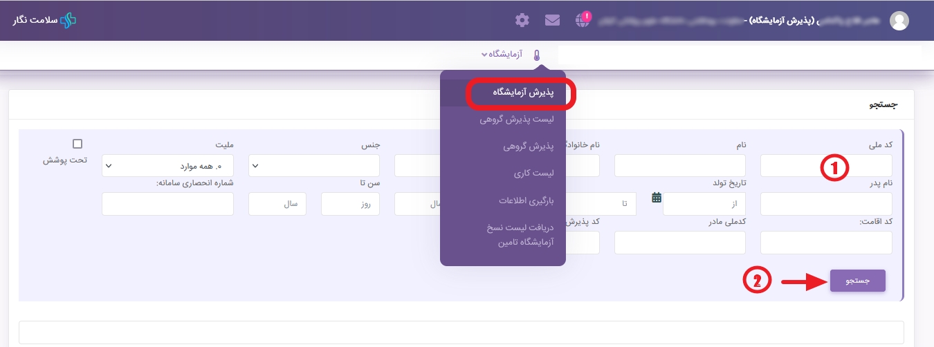 ابتدا به منو آزمایشگاه، صفحه پذیرش آزمایشگاه مراجعه کنید. کد ملی مراجعه کننده ( اگر مراجعه کننده ایرانی بود) و یا کد اقامت ۱۲ رقمی ( اگر مراجعه کننده اتباع خارجی بود) را در فیلد مخصوص به خود تایپ و سپس از گزینه جستجو استفاده نمایید.