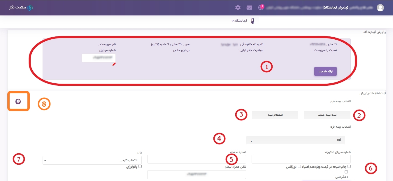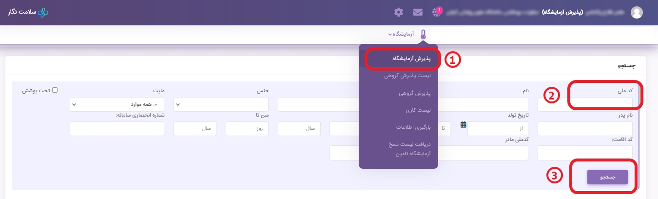 همکار محترم پذیرش آزمایشگاه، جهت پذیرش مراجعه کننده خود با نقش پذیرش آزمایشگاه، از طریق زیر اقدام کنید: