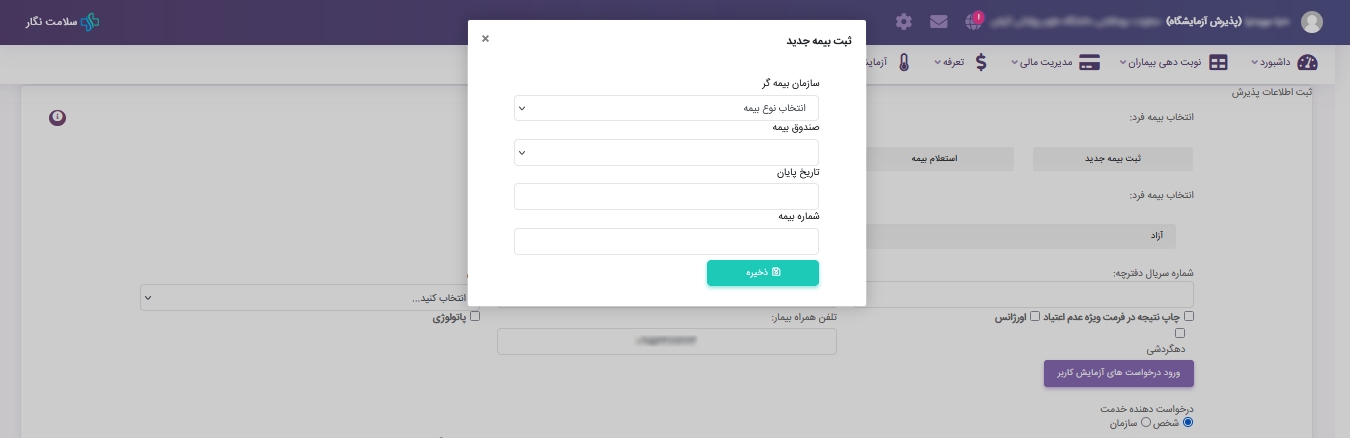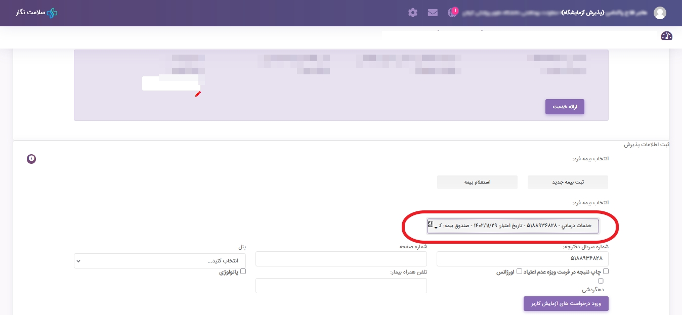 4- انتخاب بیمه فرد: در این فیلد بیمه هایی که مراجعه کننده تحت پوشش آنها هست را به شما نمایش میدهد.