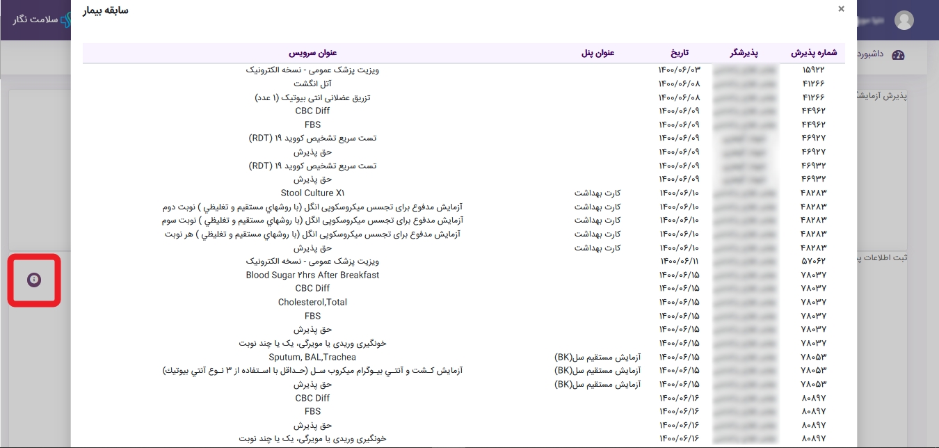 8- سابقه پذیرش بیمار: این ویژگی به شما امکان رویت سابقه پذیرش بیمار در یک نگاه اجمالی را میدهد. در این پنجره میتوانید تاریخ پذیرش های قبلی به همراه خدماتی که در آن تاریخ برای این فرد ارایه شده، (بصورت پنل و یا پذیرش آزمایشگاه عادی)، را ببینید.