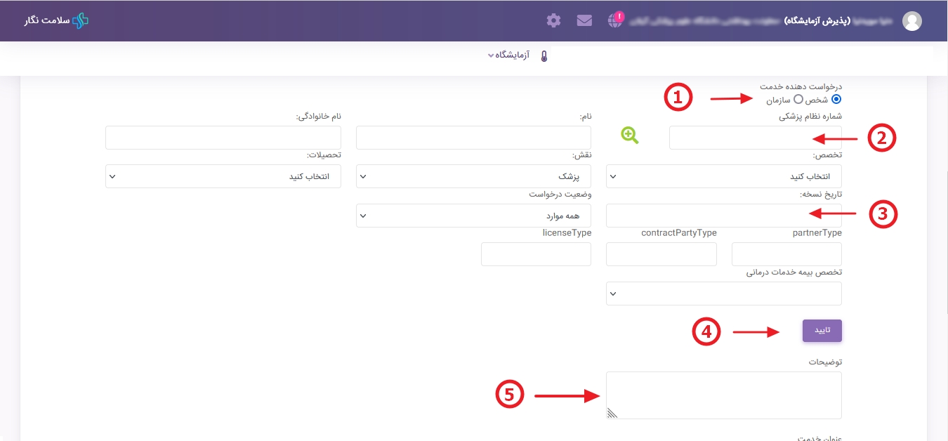 5- توضیحات: این باکس جهت ثبت شرح حال اولیه از بیمار توسط پذیرش کننده ایجاد شده و در لیست کاری فرد به فرد و همچنین صفحه جوابدهی به کارشناس آزمایشگاه نمایش داده میشود.