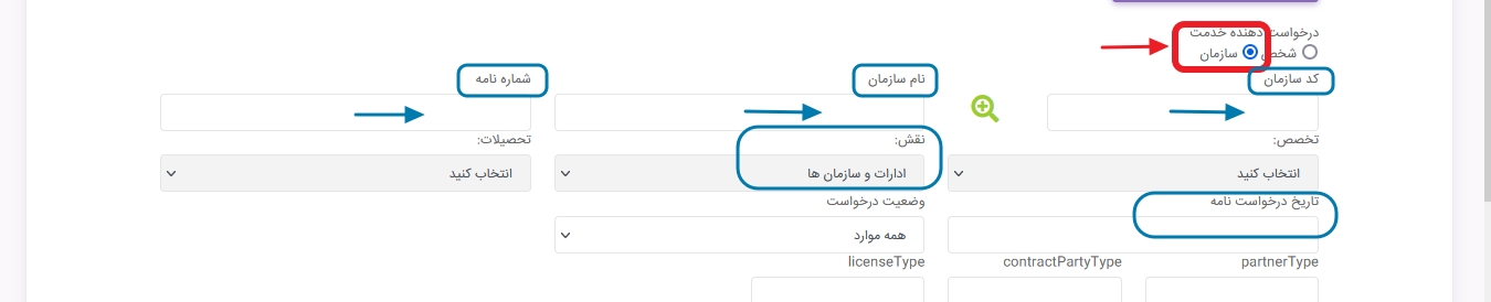 1- درخواست دهنده خدمت (شخص) یا (سازمان): بصورت پیش فرض روی شخص تنظیم شده چون بیشترین مراجعه به مراکز با نسخه پزشک انجام میشود. اگر مراجعه کننده به همراه نامه از سازمان خاصی مراجعه کرده باید گزینه سازمان را انتخاب کنید.