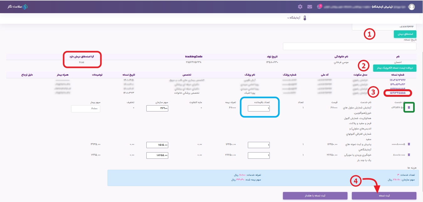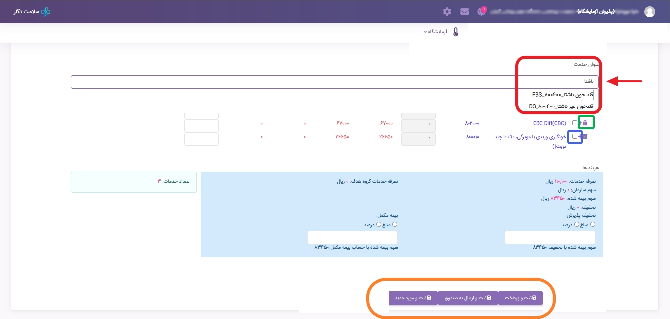 تستهایی که پزشک درخواست داده برای شما نمایش داده میشود و شما میتوانید با استفاده از دکمه های ثبت و پرداخت و یا ثبت و ارسال به صندوق نسخه خود را ثبت کنید.