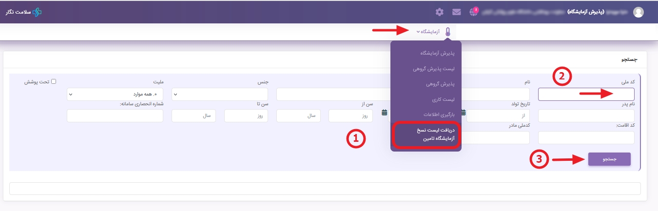 ۱- ابتدا از منو آزمایشگاه وارد صفحه دریافت لیست نسخ آزمایشگاه تامین شوید.