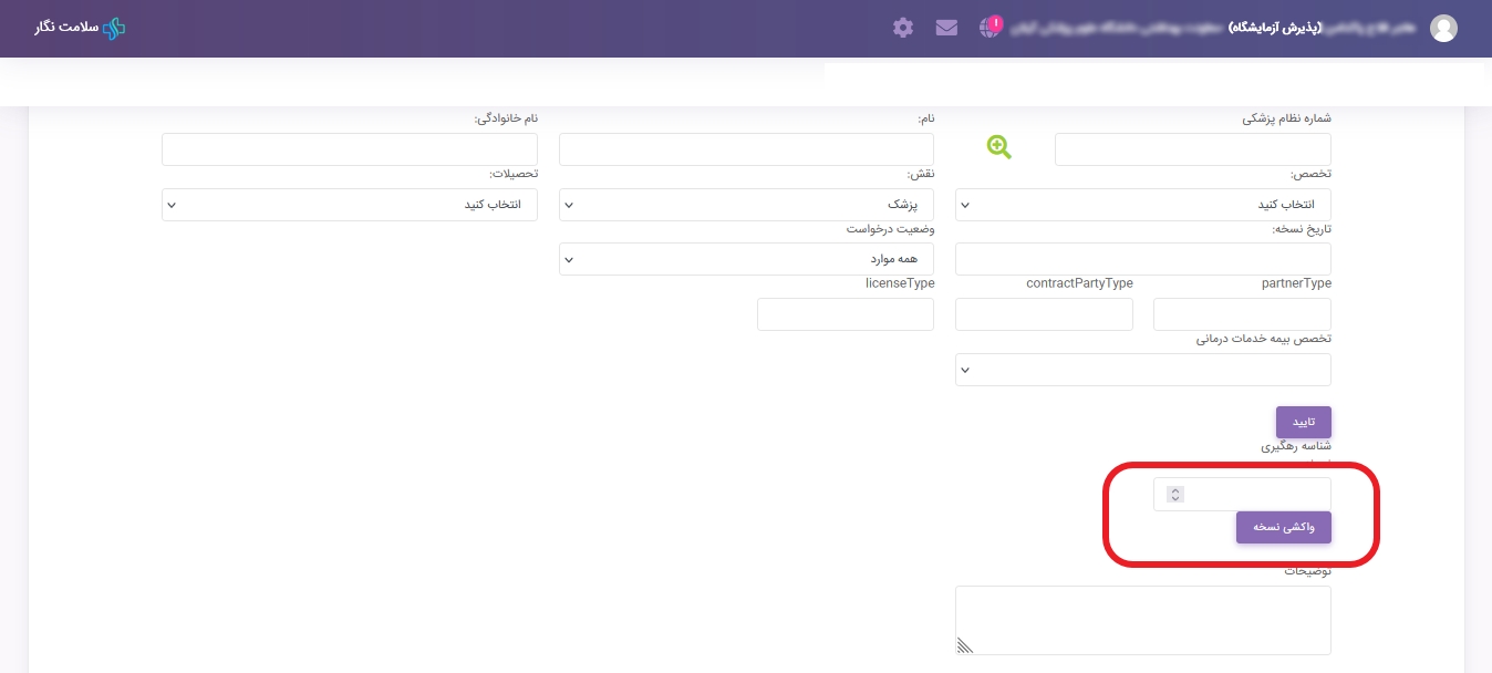 2- با تایپ شماره نظام پزشکیِ پزشک درخواست دهنده آزمایش و کلیک روی فیلد تاریخ نسخه تمام اطلاعات پزشک نمایش داده میشود.