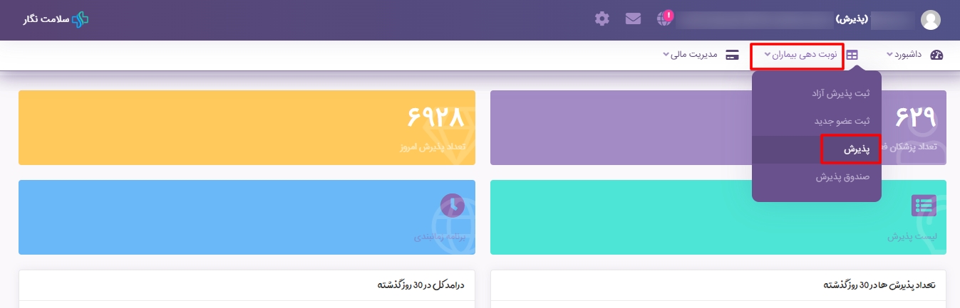 ?در منو نوبت دهی، صندوق پذیرش، امکاناتی را در اختیار شما قرار میدهد، شامل: