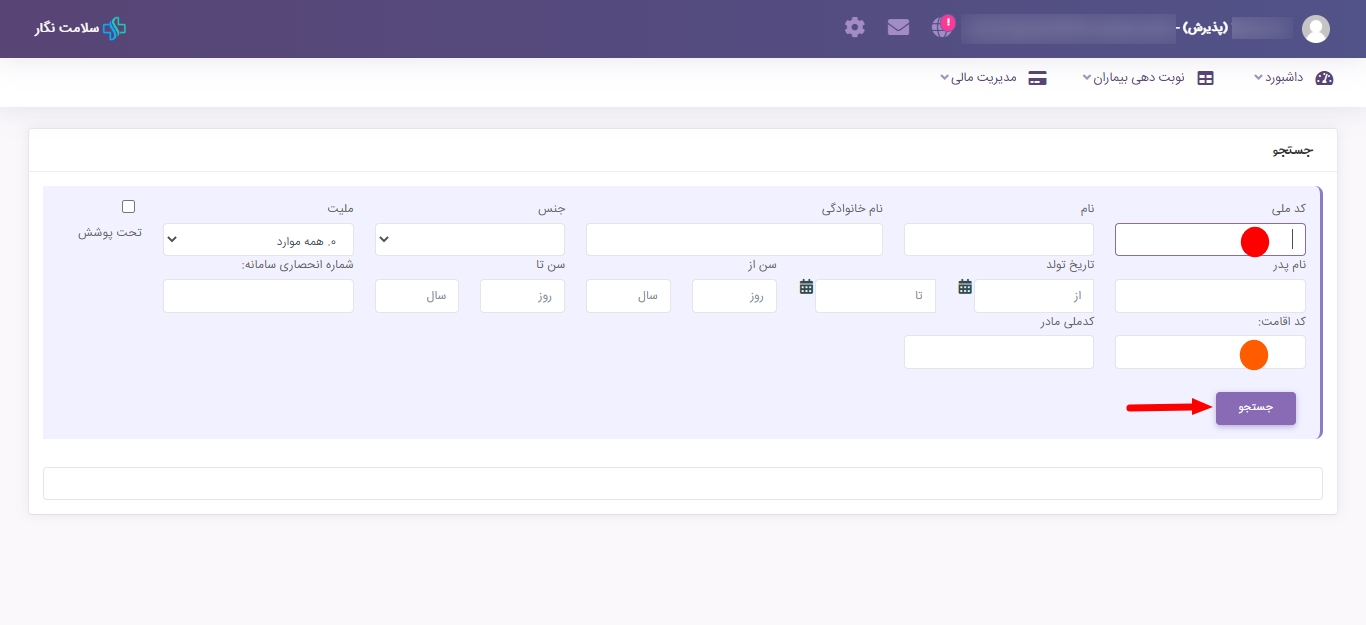 برای مراجعین ایرانی، در فیلد کد ملی ? و برای افراد غیر ایرانی در فیلد کد اقامت ? کد اقامت ۱۲ رقمی موجود در مدارک فرد را تایپ و سپس جستجو کرده و ادامه فرایند پذیرش را انجام دهید.