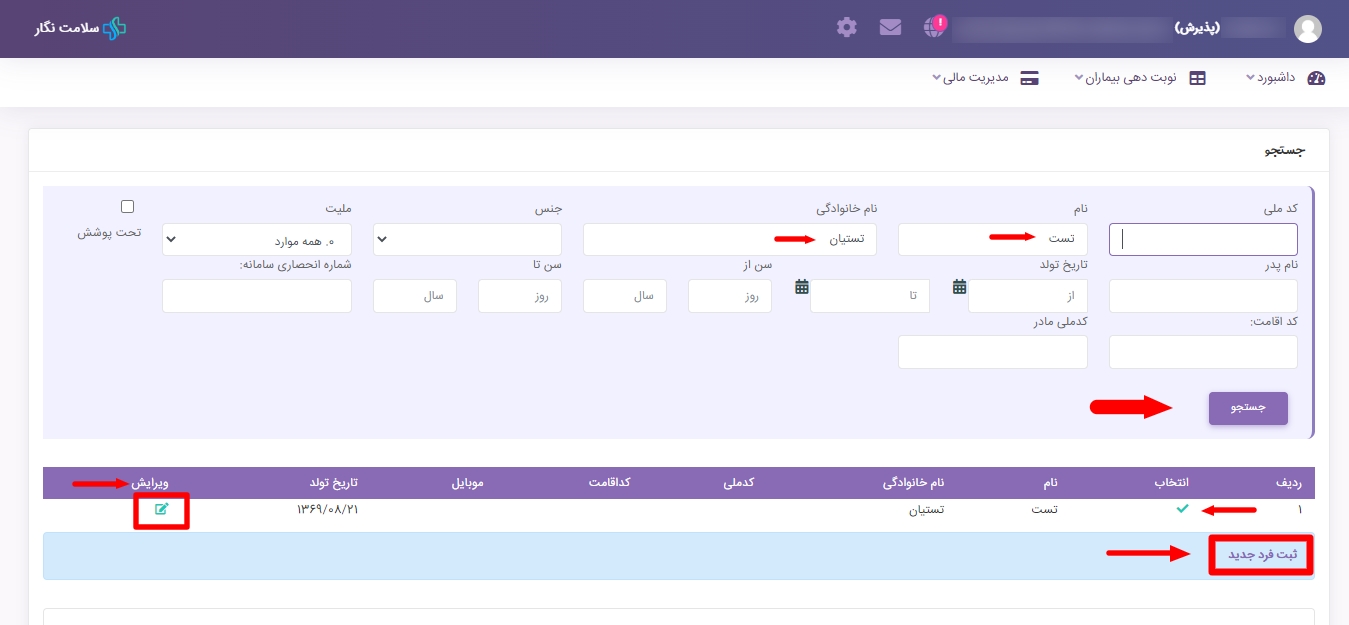 در نهایت با زدن دکمه ذخیره، اطلاعات این فرد ثبت و شما به صفحه پذیرش هدایت میشوید.