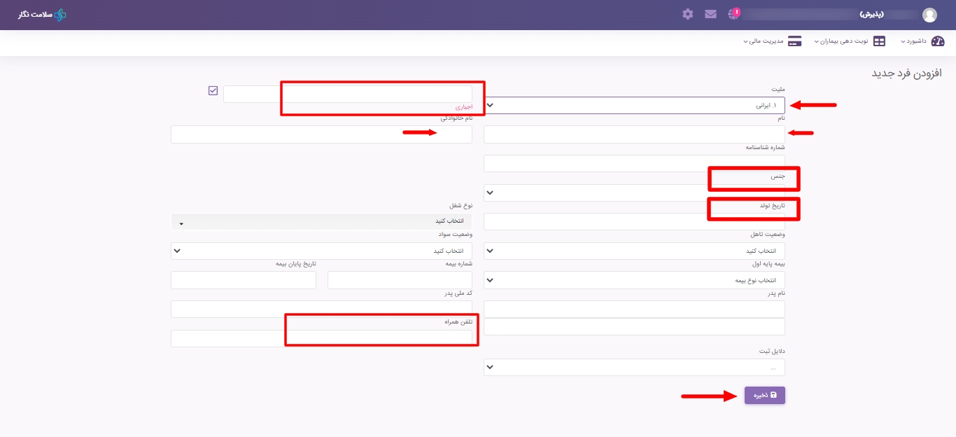 - در صورتی که مراجع ایرانی باشد باید ملیت را ایرانی و حتما کد ملی فرد مورد نظر را ثبت نمایید.