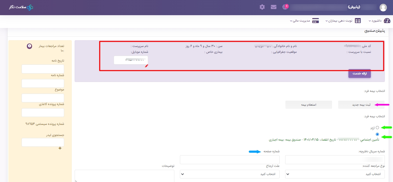 ? استعلام بیمه نمایش داده شده که میتوانید آزاد یا بیمه بودن پذیرش را انتخاب کنید.