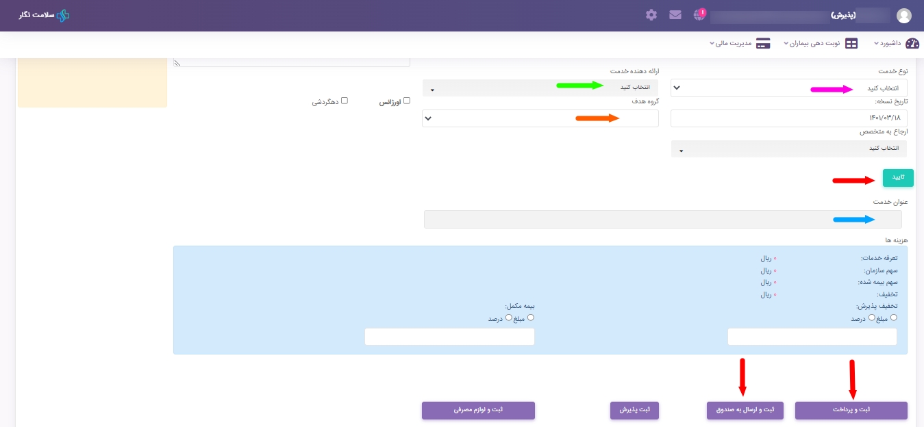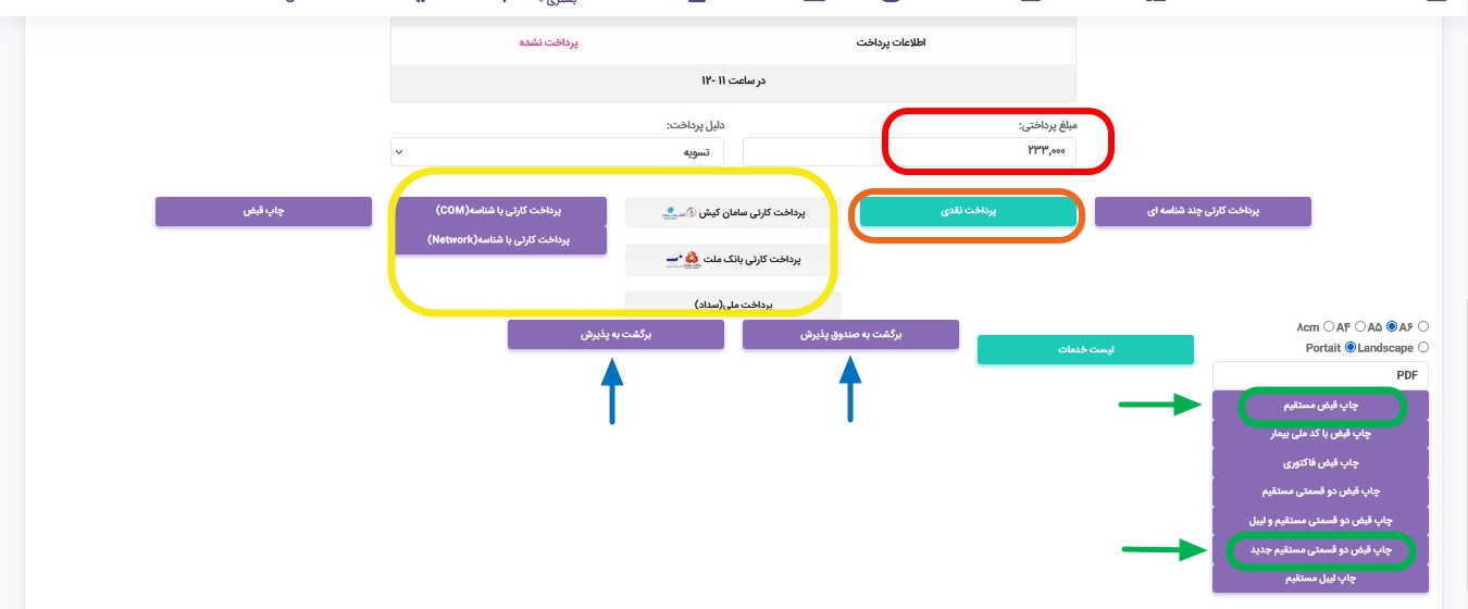 ? پرداخت: که در این صفحه، فرآیند پرداخت هزینه بیمار به صورت نقدی یا کارتی انجام میشود.