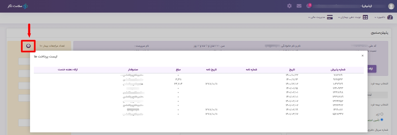 تذکر: کاربران صندوقدار میتوانند به ترتیب ساعت و یا شماره پذیرش، مراجعین را جهت پرداخت فراخوانند.