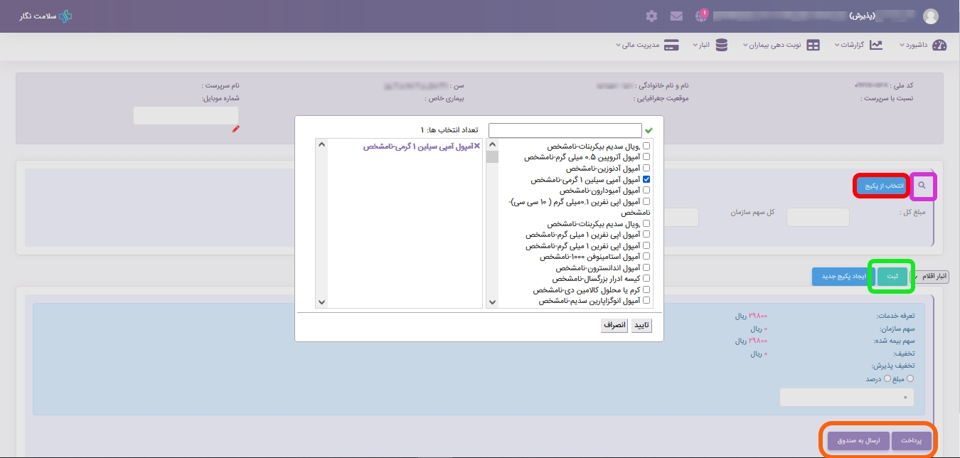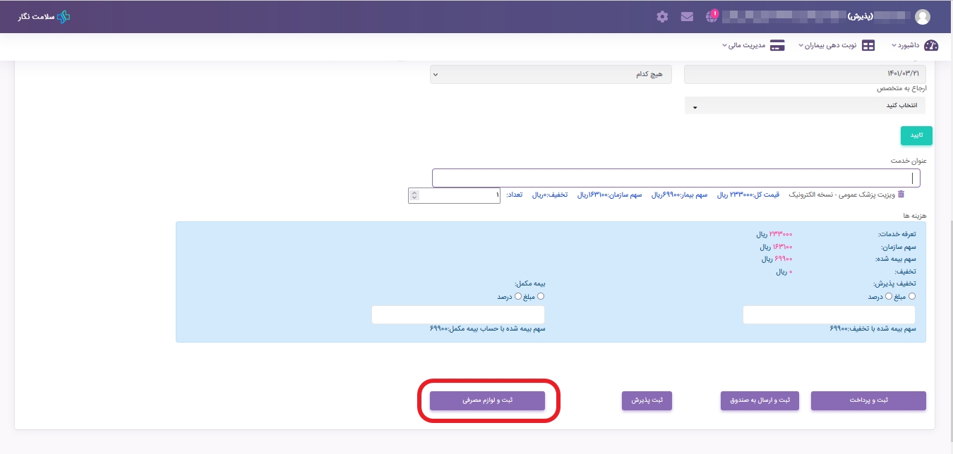 ? در پایان پذیرش نیز اگر نیاز به ثبت لوازم مصرفی نبود میتوانید بطور مستقیم با استفاده از یکی از دکمه های ثبت و پرداخت و یا ثبت و ارسال به صندوق بنا به سیستم کاری هر مرکز، اقدام به نهایی کردن پذیرش نمایید.