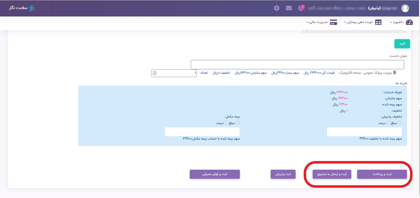 تذکر: اگر از دکمه ثبت و پرداخت استفاده کنید مستقیما به صفحه پرداخت منتقل میشوید. (برای مراکزی که پذیرش کننده عملیات دریافت هزینه را انجام میدهد) و اگر از دکمه ثبت و ارسال به صندوق استفاده کنید، پذیرش به صندوق پذیرش منتقل میشود تا مراحل پرداخت توسط صندوقدار انجام شود (برای مراکزی که پذیرش کننده عملیات دریافت هزینه را انجام نمیدهد).