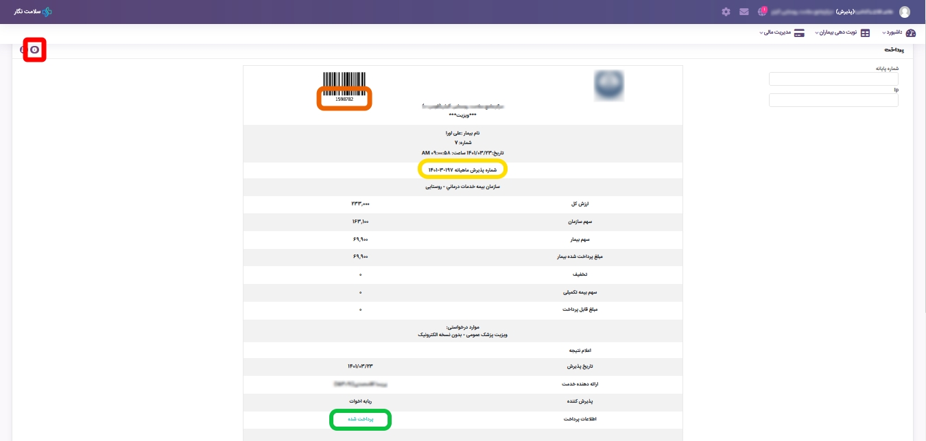 در تصویر زیر صفحه پرداخت را میبینید که حاوی برخی اطلاعات که در قبض بیمار نیز چاپ میشود، میباشد.