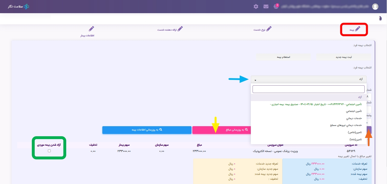 ? از طریق کشو انتخاب بیمه فرد، میتوانید نوع بیمه را تغییر دهید که پس از این فرآیند باید به وسیله گزینه ? مشاهده تغییر مبالغ و سپس ? بروز رسانی مبالغ را انجام دهید تا اگر اختلاف تعرفه وجود دارد تغییر تعرفه در صورتحساب اعمال گردد و گزینه پرداخت و یا استرداد وجه جهت تکمیل فرآیند پرداخت، فعال گردد.