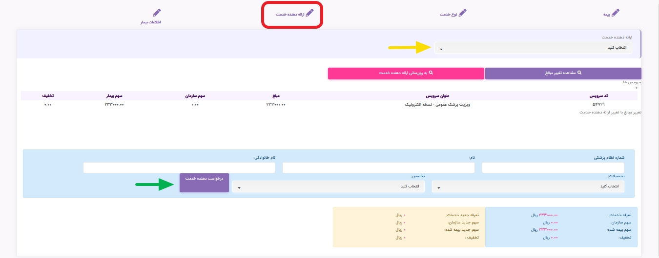 ?با انتخاب نوع خدمت، پزشک یا ارایه دهنده خدمتی که برای آن خدمت در مرکز شما درنظر گرفته شده به شما نمایش داده میشود.