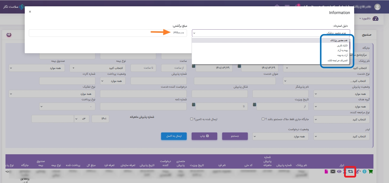 ?همانطور که قبلا به آن اشاره شد امکان استرداد وجه در منو نوبت دهی بیماران، صندوق پذیرش، در اختیار شما قرار گرفته.